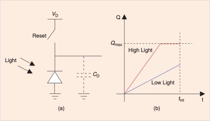 重置開關在曝光周期開始時閉合,以將光電二極管反向偏置到VD電壓。接下來,開關斷開,并產(chǎn)生與入射光強度成比例的光電流。該電流在毫微微安至皮安安的范圍內(nèi),并且太小而無法直接測量。如果我們讓光電二極管在設定的時間段內(nèi)(色調(diào))曝光,則電流將在二極管電容CD上積分。所存儲的電荷為我們提供了更容易測量的更強的累積信號。此外,合并的平均過程使累積的信號更真實地表示所測量的光強度,尤其是在處理微弱或嘈雜的信號時。