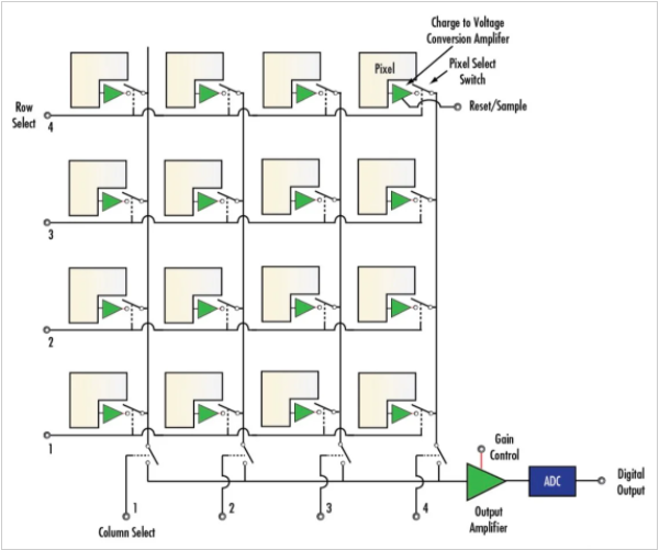 光電探測器的二維陣列用于感測入射光強度。光電探測器產(chǎn)生的電荷被轉換為電壓信號,并通過“行選擇”和“列選擇”開關陣列傳遞到輸出放大器。ADC用于數(shù)字化放大后的信號。