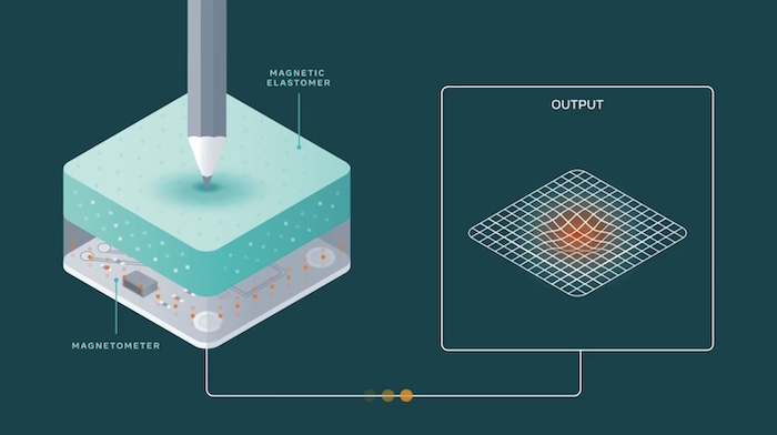 根據(jù)該出版物,當(dāng)這種材料變形時(shí),它會(huì)導(dǎo)致其磁場(chǎng)發(fā)生變化,附近的磁力計(jì)可以察覺到這種變化。然后,系統(tǒng)使用基于人工智能的技術(shù)將這些數(shù)據(jù)解釋為相關(guān)信息,例如接觸位置和施加的力。