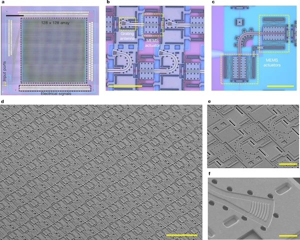 由此產(chǎn)生的設(shè)備在 1 平方厘米的固態(tài)芯片上創(chuàng)建了 128x128 像素陣列。研究人員聲稱,該芯片上的 16,348 像素遠(yuǎn)遠(yuǎn)超過(guò)了之前達(dá)到的數(shù)量,使其成為市場(chǎng)上分辨率的固態(tài) FPSA 芯片。