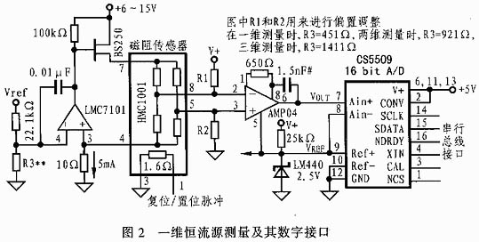 圖2所示是一個(gè)一維恒流源的測(cè)量和數(shù)字接口電路,其二維恒流源的測(cè)量及數(shù)字接口電路如圖3所示。