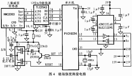 圖4是一個(gè)使用HMC2003磁敏傳感器、12位A/D轉(zhuǎn)換器、PIC16C54單片機(jī)、RS232接口和置位/復(fù)位電路構(gòu)成的三維磁場(chǎng)測(cè)量電路。