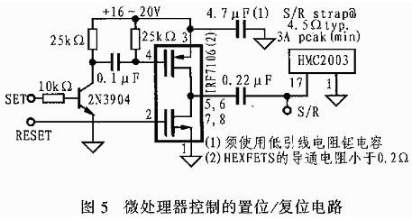 圖5是一種可在微處理器的控制下產(chǎn)生大于4A的置位/復(fù)位強(qiáng)脈沖電路圖。利用該電路可在微處理器的控制下產(chǎn)生置位和復(fù)位信號(hào)以控制HEXFET驅(qū)動(dòng)器(IRF706)的P和N通道。引入TRS和TSR延時(shí)的目的是確保在一個(gè)HEXFET開通之前使另 個(gè)HEXFET閉合,這類似一個(gè)先開后保的開關(guān)接點(diǎn)。利用這一開關(guān)可在4.7μF電容和脈沖輸出點(diǎn)之間串接一個(gè)500Ω的分壓電阻。如果不使用微處理器,也可用時(shí)鐘信號(hào)來(lái)觸發(fā)置位和復(fù)位信號(hào)。