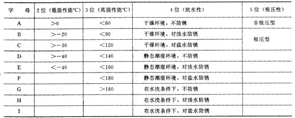 第1個(gè)字母代表潤(rùn)滑脂;第2~5個(gè)字母的含義如表1所示。
