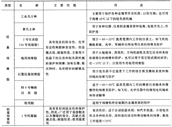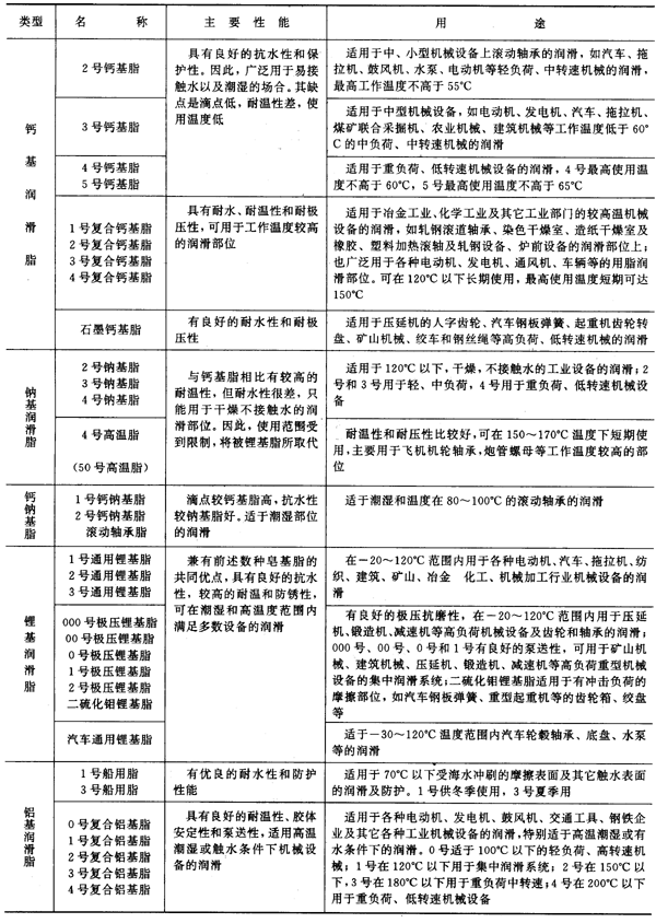 礦油類潤(rùn)滑脂品種較多,目前廣泛使用的主要品種、性能及用途見(jiàn)表10。其中,鋰基潤(rùn)滑脂幾乎兼?zhèn)淦渌砘膬?yōu)點(diǎn),在多數(shù)場(chǎng)合下都可取代其它皂基脂,是國(guó)內(nèi)推廣應(yīng)用的新品種。