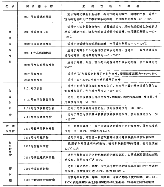 合成油經(jīng)稠化而成的潤(rùn)滑脂統(tǒng)稱合成(油)潤(rùn)滑脂,均系特殊性能的潤(rùn)滑脂。表11為幾種合成脂的性能及主要用途。