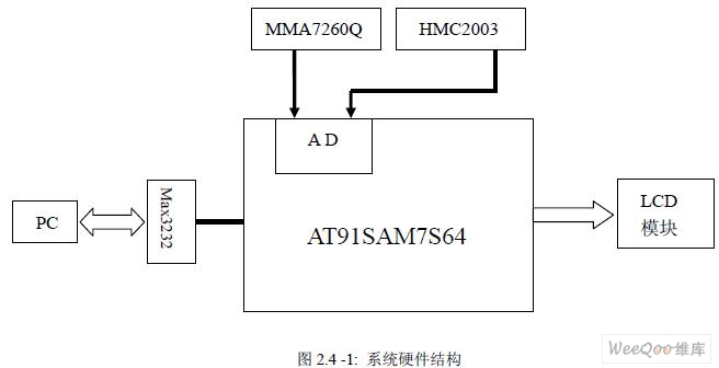 本系統(tǒng)的硬件結(jié)構(gòu)如圖2.4 -1 所示。 由于At91sam7s64 具有片上A/D 轉(zhuǎn)換器而且具有8 選1 模擬復(fù)用器,使得MMA7620Q 和HMC2003 可以直接與微控制器相連而不必外加A/D 轉(zhuǎn)換器和復(fù)用器,不僅降低了系統(tǒng)的 成本和體積,提高了系統(tǒng)的集成度,同時減少了誤差源,提高了精度。經(jīng)過A/D 轉(zhuǎn)換的測量數(shù)據(jù)經(jīng)過ARM 核的處理后,被送到串口LCD 并通過RS232 接口送入PC 機進行進一步 的分析。