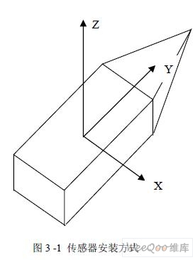在本系統(tǒng)中,三軸加速度計和三軸 MR 傳感器都以以下的方式安裝于電路板上:它們 的X 軸平行于系統(tǒng)的橫軸指向右,Y 軸平行于系統(tǒng)的縱軸指向前,X、Y、Z 軸定義為右手 坐標系統(tǒng),如圖3 -1 所示。