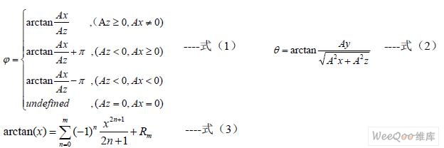 為了獲得系統(tǒng)基于重力向量的俯仰角θ 和橫滾角φ,需要使用加速度計的三個輸出:Ax, Ay, Az 。俯仰角和橫滾角可以通過以下公式(1)和公式(2)計算得到。對于微控制器,函數(shù) 中的arctan(x) 需要通過以下公式(3)的泰勒展開后才能計算得到。