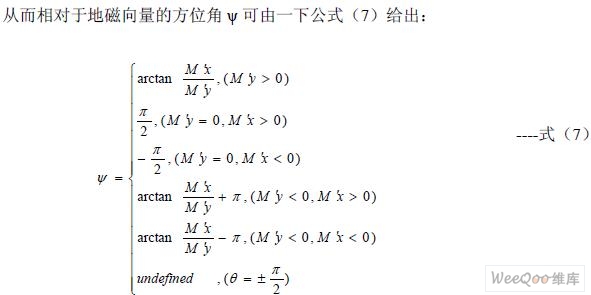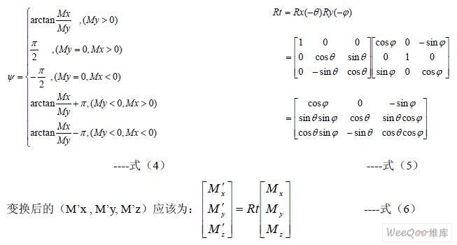 為了獲得系統(tǒng)相對于當(dāng)?shù)氐卮畔蛄康姆轿唤,需要使用MR 傳感器的三個輸出Mx, My, Mz 。當(dāng)系統(tǒng)置于水平狀態(tài)時(俯仰角和橫滾角都為0)時,方位角ψ 可以由公式(4)直 接給出,但是在大多數(shù)情況下,系統(tǒng)并不是工作在水平狀態(tài),此時地磁場的豎直分量將會影 響Mx 和My 的值,因此不能直接由公式(4)獲得相對于地磁向量的方位角。為了在所有 情況下都能獲得正確的方位角,必須將俯仰角和橫滾角考慮在內(nèi),即必須通過以俯仰角和橫 滾角為參數(shù)的坐標變換,將測得的(Mx, My, Mz)向量變換為與載體坐標系有相同方位角的 水平坐標系下的向量(M’x , M’y, M’z),其變換矩陣如公式(5)。