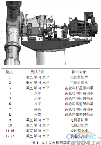 基于以上測點選取的原理,根據(jù)風(fēng)力發(fā)電機組的結(jié)構(gòu)特點、性能參數(shù)和工作原理,同時根據(jù)積累的現(xiàn)場測試經(jīng)驗,大致確定風(fēng)力發(fā)電機組的測試點如圖1所示。