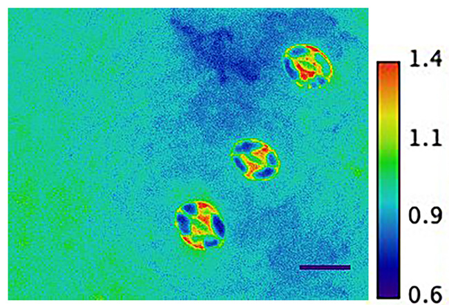 該圖像描繪了三個擬南芥葉表面的孔或氣孔,它們表達了由加州大學(xué)圣地亞哥分校的植物生物學(xué)家開發(fā)的新型SNACS應(yīng)力納米傳感器。圖片來源:圣地亞哥加州大學(xué)施羅德實驗室