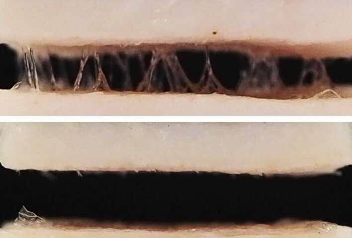 盡管PVA具有許多吸引人的特性,但潮濕時(shí)仍會(huì)輕易脫落。因此,研究人員通過(guò)添加烷基鏈來(lái)修飾該化合物,以提高其附著力。他們制作了帶有三個(gè),六個(gè)或九個(gè)亞甲基碳的鏈的變體,然后對(duì)其進(jìn)行了測(cè)試,以查看哪種碳纖維性能最好。事實(shí)證明,由較長(zhǎng)鏈形式制成的薄膜具有更大的疏水性,但拉伸強(qiáng)度卻更低。細(xì)胞最能耐受稱為4C3-PVA的短鏈,在豬皮試驗(yàn)中,他們發(fā)現(xiàn)其結(jié)合最牢固。研究人員得出結(jié)論,4C3-PVA是可穿戴設(shè)備的一種有前途的粘合劑。