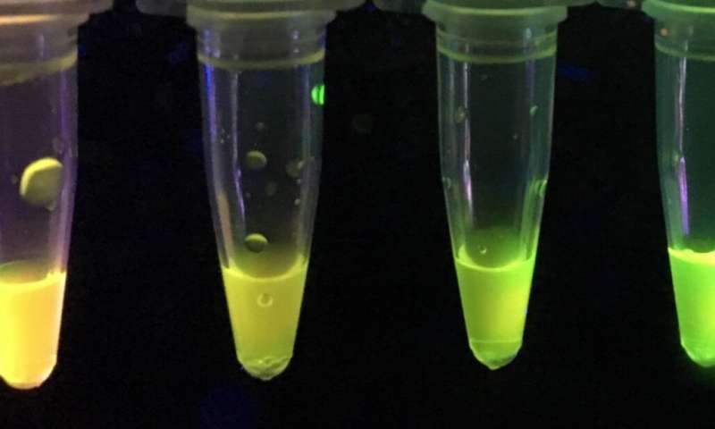 為了構(gòu)建傳感器,研究團隊將綠色熒光蛋白與發(fā)射紅光的硅基量子點結(jié)合在一起。當暴露于對氧磷或?qū)α蛄字袝r,混合物不再發(fā)出紅光,導致傳感器在熒光燈下變成黃色或綠色的各種陰影。