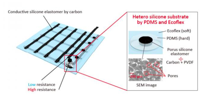 有機硅基材由兩種不同類型的有機硅制成-一種硬而一種軟。較硬的有機硅(PDMS)可以抑制壓力感應元件在應變下的變形。圖片由橫濱國立大學大田裕樹提供
