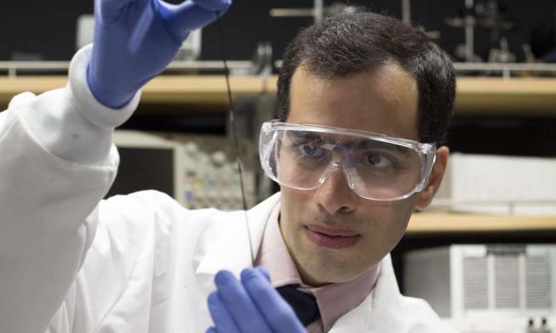 UBC博士生Hossein Montazerian仔細(xì)觀察了嵌入纖維中的微型傳感器。圖片來源:UBCO Okanagan
