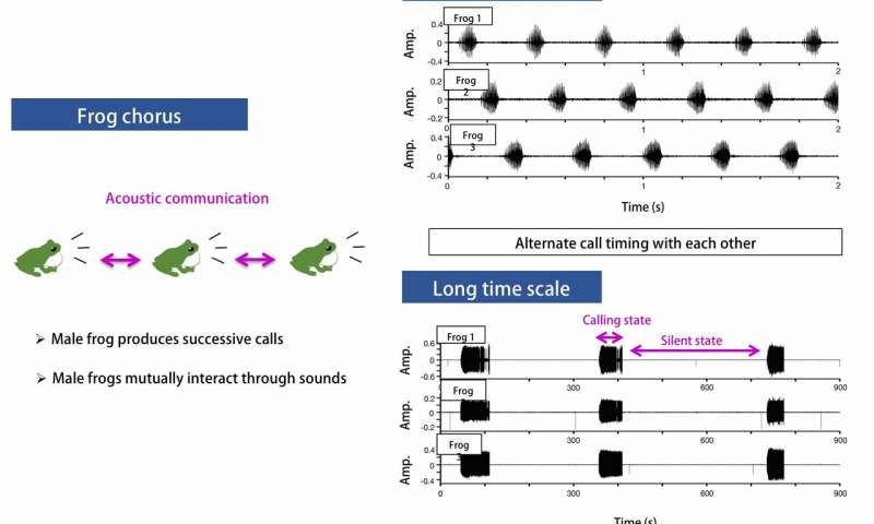 在觀察到的青蛙三重奏中,有時還會在集體沉默和合唱之間交替出現(xiàn)。避免重疊是一致的(確定性的),而后面的集體召集則更具多樣性(隨機(jī)的)。該模式的另一個實(shí)用工具是它如何巧妙地使青蛙從它們的呼喚中休息,這需要大量的能量。