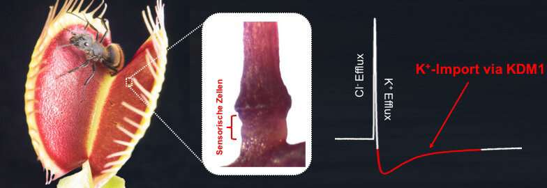 捕蠅草的潛在陷阱。中部:觸發(fā)發(fā)的基部,在觸覺(jué)刺激下,感覺(jué)細(xì)胞會(huì)誘發(fā)動(dòng)作電位。在動(dòng)作電位的后期,需要通過(guò)KDM1將鉀離子重新導(dǎo)入感覺(jué)細(xì)胞,以產(chǎn)生連續(xù)的動(dòng)作電位。圖片來(lái)源:Ines Kreuzer,Soenke Scherzer /維爾茨堡大學(xué)