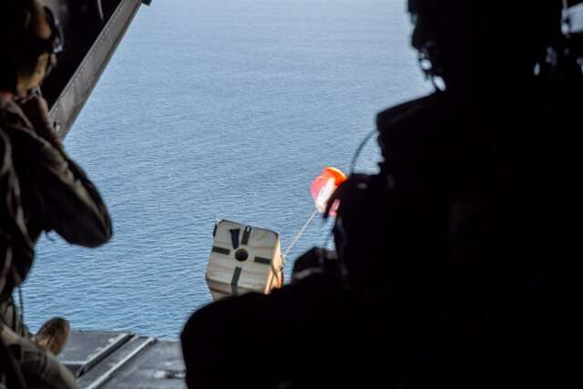 伍茲霍爾海洋研究所的一名乘務(wù)員和一名科學(xué)家在太平洋上空飛行了數(shù)千英尺,將一架美國(guó)海軍陸戰(zhàn)隊(duì)MV-22魚鷹式飛機(jī)的圓柱狀浮標(biāo)扔了起來(lái)。裝有數(shù)據(jù)收集傳感器以測(cè)量水下狀況,浮子在打開橙色降落傘以緩解飛濺之前迅速墜落。