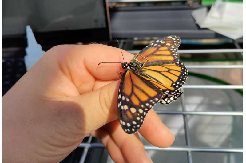 為了測試 mSAIL 的潛力,研究人員將該系統(tǒng)連接到植物園中的一只活帝王蝶身上。芯片粘在蝴蝶上;它沒有問題飛行,打開和關閉它的翅膀,或者在芯片就位的情況下進行任何其他正常的蝴蝶行為。