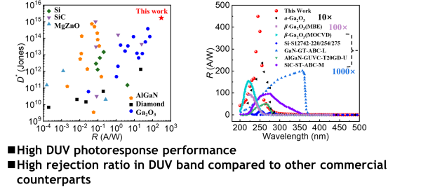 圖2.該工作與其他已報(bào)道的深紫外探測器性能對比