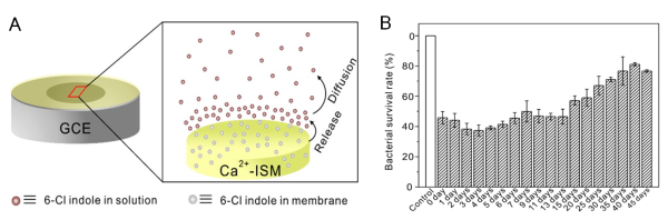 圖2.基于6-氯吲哚緩釋的防污損聚合物膜電位型傳感器的結(jié)構(gòu)(A)和長期防污損效果(B)