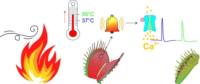 捕蠅草的感覺毛上有一個熱傳感器,通過它,它可以在叢林大火爆發(fā)前對熱浪做出反應(yīng)。如果溫度迅速超過37°C的標(biāo)志,鈣依賴性動作電位(AP)被觸發(fā)作為警告信號。如果溫度上升到55°C的閾值,則發(fā)射第二次AP,陷阱關(guān)閉,感覺毛被保護(hù)起來不被燒傷。資料來源:黃壽光/德國維爾茨堡大學(xué)