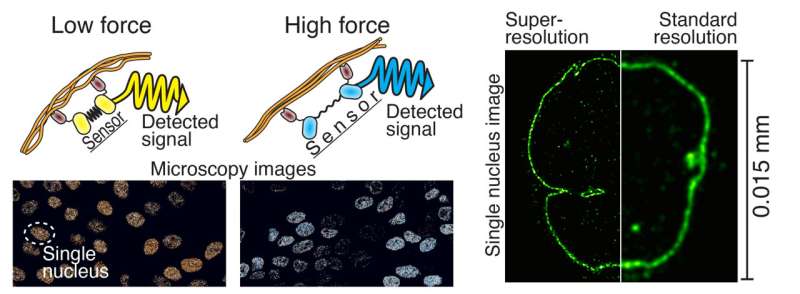 細胞內(nèi)力傳感器的作用原理為左。熒光蛋白(黃色和青色)來自水母,而橡皮筋部分(黑色)利用了蜘蛛網(wǎng)蛋白。靶蛋白結(jié)合抗體(深棕色)來源于羊駝。右圖是超分辨率顯微鏡和常規(guī)顯微鏡對細胞核成像的比較。資料來源:坦佩雷大學(xué)Teemu Ihalainen