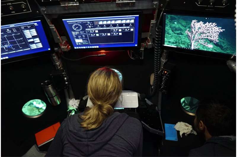 WHOI 科學家 Colleen Hansel 在 HOV Alvin 內(nèi)部。圖片來源:伍茲霍爾海洋研究所)