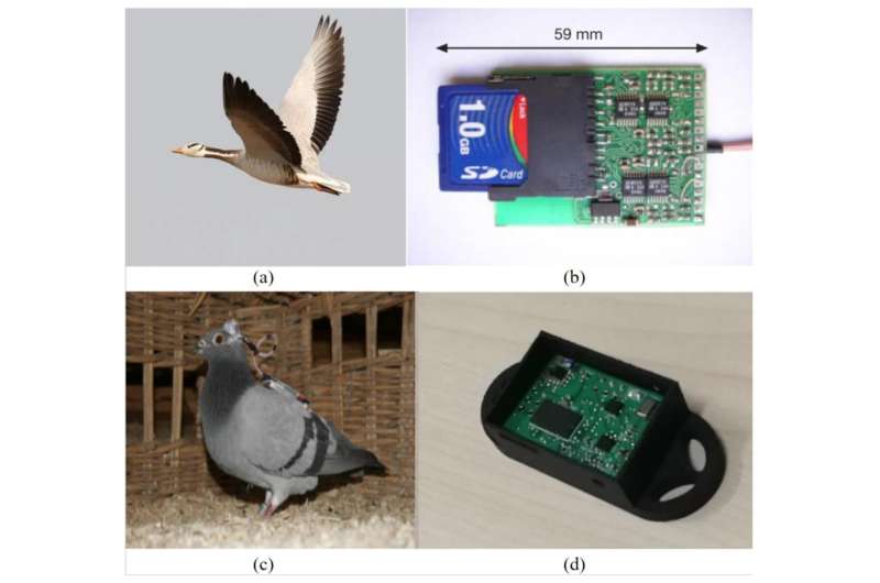 (a) 大型候鳥,斑頭雁,在飛行中。(b) 神經記錄器:收集鴿子腦電信號和GPS位置信息,并將其記錄在SD卡上[7]。(c) 安裝在信鴿頭部和背部的神經記錄器。(d) 鳥類可穿戴生物記錄儀收集有關心率、血氧飽和度、加速度、磁場、氣壓和溫度的信息。圖片來源:電子(2023 年)。DOI: 10.3390/electronics12204373