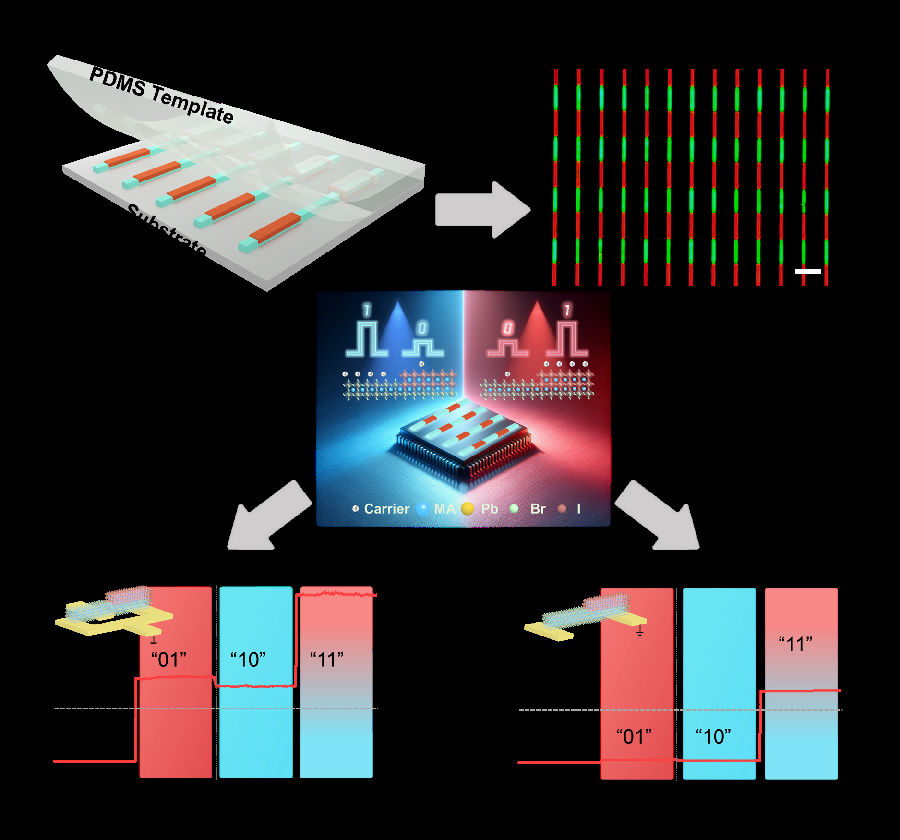 中國科學(xué)院化學(xué)研究所綠色印刷院重點(diǎn)實(shí)驗(yàn)室宋延林課題組開展了可控印刷多維度、多功能微納傳感器件等方面的研究,并取得了進(jìn)展。近期,該課題組利用模板輔助連續(xù)印刷策略可控制備鈣鈦礦異質(zhì)結(jié)構(gòu)陣列,并實(shí)現(xiàn)光控邏輯運(yùn)算。該策略印刷制備MAPbBr3陣列,進(jìn)而在預(yù)成型MAPbBr3陣列和模板的協(xié)同誘導(dǎo)作用下,在MAPbBr3陣列的特定位點(diǎn)處精準(zhǔn)印刷構(gòu)筑MAPbI3異質(zhì)區(qū)域。在異質(zhì)區(qū)域的引入過程中,該研究通過精準(zhǔn)調(diào)控MAPbI3前驅(qū)體溶液中DMF/MAAc二元溶劑的比例和濃度,避免該過程對(duì)預(yù)成型MAPbBr3陣列的損傷,并抑制瑞利失穩(wěn)效應(yīng),改善MAPbI3的結(jié)晶質(zhì)量,從而制備具有多異質(zhì)區(qū)域且形貌均勻可控的MAPbBr3-MAPbI3異質(zhì)結(jié)構(gòu)陣列。MAPbBr3-MAPbI3異質(zhì)結(jié)構(gòu)的不同區(qū)域可以對(duì)不同波長(zhǎng)的入射光展現(xiàn)出不同的邏輯態(tài)。該工作結(jié)合電極設(shè)計(jì),在單個(gè)鈣鈦礦異質(zhì)結(jié)構(gòu)單元上實(shí)現(xiàn)了“與”和“或”邏輯門,并在鈣鈦礦異質(zhì)結(jié)構(gòu)陣列上以100%的準(zhǔn)確率實(shí)現(xiàn)了相應(yīng)的邏輯操作。