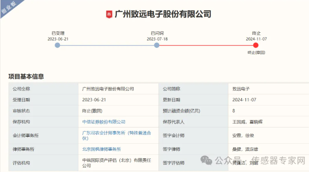 隨著經(jīng)濟(jì)環(huán)境的變化和金融政策的收窄,2024年以來(lái),已有多家傳感器企業(yè)IPO終止。 11月7日,深圳證券交易所公告顯示,又有一家中國(guó)傳感產(chǎn)業(yè)鏈知名企業(yè)——廣州致遠(yuǎn)電子股份有限公司(下文簡(jiǎn)稱“致遠(yuǎn)電子”)IPO終止。 從上市信息看,致遠(yuǎn)電子于2023年6月21日向深交所提交IPO申請(qǐng)獲受理,2023年7月18日獲問(wèn)詢,并于2024年11月7日終止IPO審核,終止原因?yàn)椤皬V州致遠(yuǎn)電子股份有限公司、保薦人撤回發(fā)行上市申請(qǐng)”。本次致遠(yuǎn)電子IPO的保薦機(jī)構(gòu)