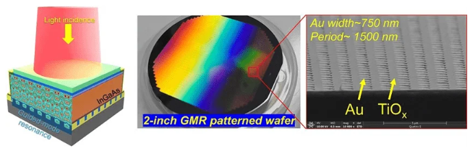 本研究中提出的集成在導(dǎo)模共振(GMR)結(jié)構(gòu)上的銦鎵砷光電二極管圖像傳感器示意圖(左)、制造出的晶圓照片以及周期性圖案的掃描電子顯微鏡(SEM)圖像(右)。圖片來源:韓國科學技術(shù)院