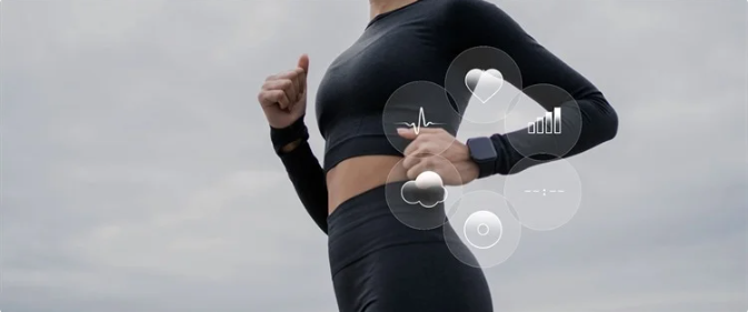 圖片中一位女性戴著智能手表,使用跑步時(shí)的心率和脈搏傳感器。