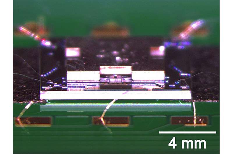封裝好的 MEMS-TMPhC 設(shè)備與印刷電路板進(jìn)行引線鍵合的側(cè)視圖。圖片來(lái)源:《自然・光子學(xué)》(2025 年)。https://doi.org/10.1038/s41566-025-01650-z