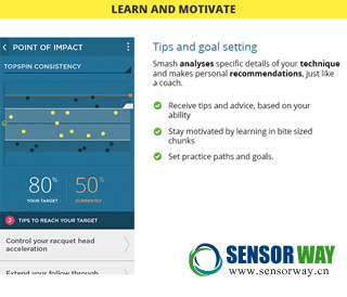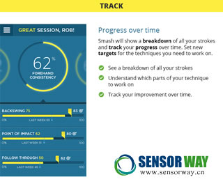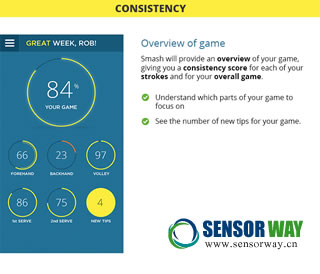 Smash網(wǎng)球運動監(jiān)測手環(huán)能夠充當(dāng)個人網(wǎng)球教練的角色,可以用來記錄發(fā)球的種類和次數(shù)、球拍頭的速度和軌跡、旋轉(zhuǎn)的數(shù)量、手腕的旋轉(zhuǎn)等信息。它還能通過這些數(shù)據(jù)計算出訓(xùn)練、比賽中動作的一致性,從而矯正用戶的動作。從某種意義上講,它可以在一定程度上充當(dāng)個人網(wǎng)球教練的角色。