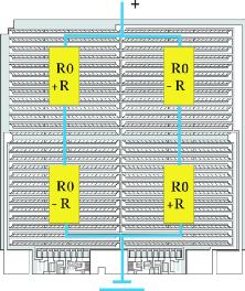 現(xiàn)代傳感器系統(tǒng)主要由兩個(gè)元件組成 —基本傳感器和信號(hào)處理專用集成電路 (ASIC)(圖 1),F(xiàn)已證明,后來由 Lord Klevin 于 1857 年發(fā)現(xiàn)的各向異性磁阻效應(yīng)特別適用于檢測(cè)磁場。首先考慮通常具有多種磁疇結(jié)構(gòu)的鐵磁性材料。這些稱之為韋斯磁疇的結(jié)構(gòu),其內(nèi)部磁化的方向彼此不同。如果將這種材料平鋪為一薄層,那么磁化矢量處于材料層平面方向。另外,可較精確地假設(shè)只存在一個(gè)磁疇。當(dāng)這種元件暴露于外部磁場中時(shí),后者會(huì)改變內(nèi)部磁化矢量的方向。如果同時(shí)一股電流通過該元件,就會(huì)產(chǎn)生電阻(圖 2),這取決于電流和磁化之間的角度。當(dāng)電流和磁化方向彼此成直角時(shí),電阻最小,當(dāng)二者平行時(shí),電阻最大。電阻變化的大小取決于材料。鐵磁性材料的性質(zhì)也決定對(duì)溫度的依賴性。電阻最大變化為 2.2% 并且對(duì)溫度變化反應(yīng)良好的最佳合金是 81% 的鎳和 19% 的鐵組成的合金。恩智浦所有傳感器系統(tǒng)中的基本傳感器都采用這種強(qiáng)磁鐵鎳合金。在惠斯登電橋電路中單獨(dú)配置幾個(gè) AMR 電阻,以增強(qiáng)輸出信號(hào)并改善溫度反應(yīng)特性。此電路也可在制造過程中進(jìn)行微調(diào)。圖 3 顯示如何在裸片上配置 AMR 元件。