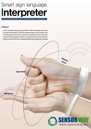 手環(huán)利用傳感器探測(cè)手指動(dòng)作,然后把偵測(cè)到的手語(yǔ)內(nèi)容,轉(zhuǎn)換成語(yǔ)音,讓正常人“聽到”意思。手環(huán)還可以將說(shuō)話內(nèi)容翻譯成手語(yǔ)手勢(shì),顯示在手環(huán)屏幕上,讓聾啞人士看到說(shuō)話內(nèi)容,成為聾啞人士與外界溝通的橋梁。